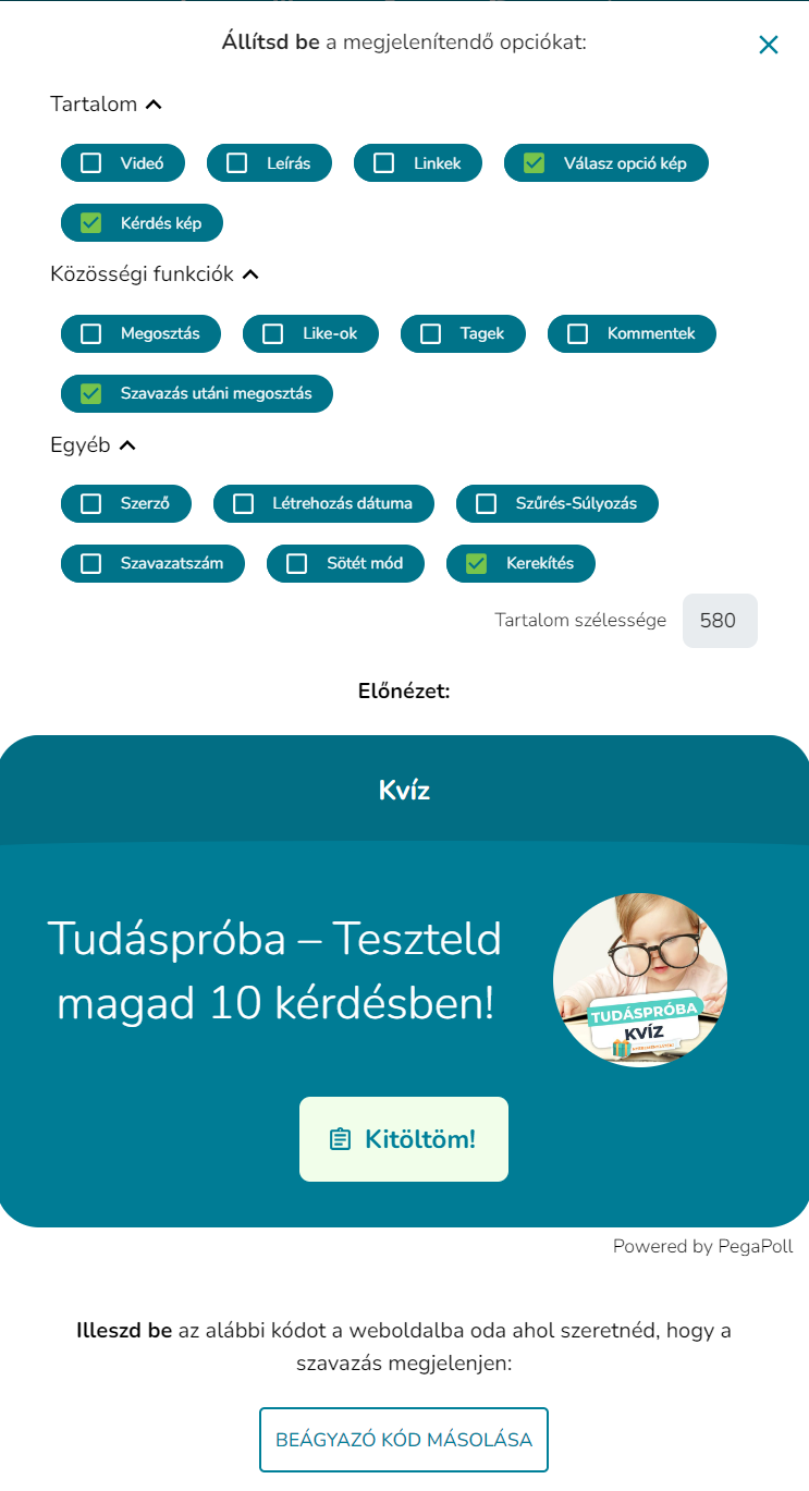 Amennyiben a létrehozott szavazás, kvíz, felmérés valamely tartalmi elemét módosítod (pl.: egy-egy elírt szó, vagy kép cserélésa, abban automaikusan frissül a beágyzaott tartalom is, nem szükséges a tartalom újbóli beágyazása.
