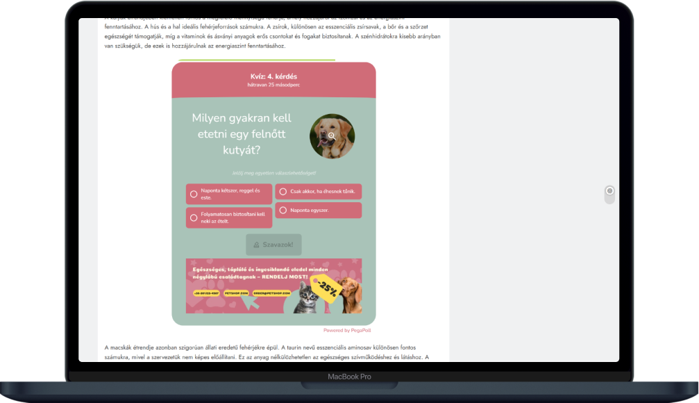 A PegaPoll beépített AI-generátor funkcióival nem csupán kvízeket, szavazásokat és felméréseket állíthatsz össze pillanatok alatt, hanem a kérdésekhez és a válaszopciókhoz tartozó képeket is mesterséges intelligenciával generálhatod – ráadásul mobilról is könnyedén kezelheted az egész folyamatot. Ez óriási előnyt jelent a mindennapi content-gyártásban, hiszen: