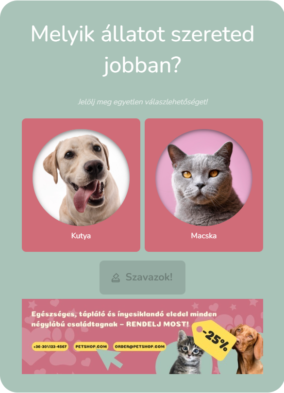 Készíts interaktív PR cikkeket, és egészítsd ki egy tematikus szavazással, felméréssel vagy kvízzel a PegaPoll segítségével! Ezekbe a tartalmakba olyan reklámokat helyezhetsz el, amelyek tökéletesen illeszkednek a cikk témájához. Így az olvasók nemcsak aktívabban kapcsolódnak a tartalomhoz, hanem jobban azonosulnak a reklámokkal is – ezáltal növeled a kampányod hatékonyságát és az olvasói elköteleződést.