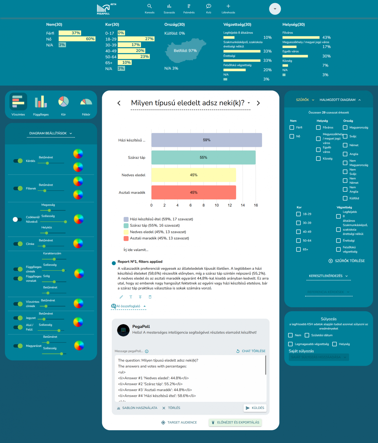 A kitöltési adatokat felmérés-, szavazás- és kvízszinten tudjuk elemezni, ezzel is jobban megismerve az olvasókat. Az adatok könnyedén szűrhetők, keresztlekérdezhetők és súlyozhatók mindössze egy-két kattintással, miközben egyedi grafikák és színek segítségével prezentálhatók.