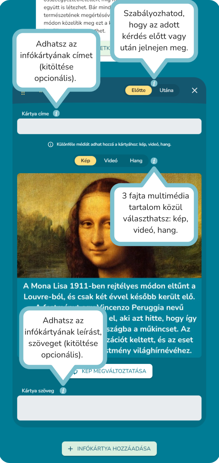 Az infókártyák nemcsak kiegészítik a kvízek tartalmát, hanem aktívan hozzájárulnak a kitöltési hajlandóság növeléséhez és az élmény gazdagításához.