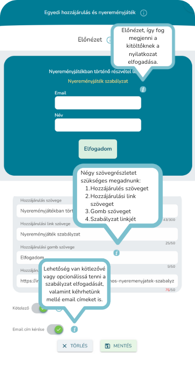 Az egyedi hozzájárulás-kezelési (custom consent) funkcióval a résztvevők adatainak begyűjtése és kezelése teljesen átlátható módon történik. Ez a megoldás nemcsak a felhasználói bizalmat növeli, hanem lehetőséget ad célzott adatbázis építésére is, amely marketing- és piackutatási célokra egyaránt felhasználható. A modul egyszerűen testreszabható, így könnyedén illeszkedik bármilyen nyereményjáték kampány igényeihez.